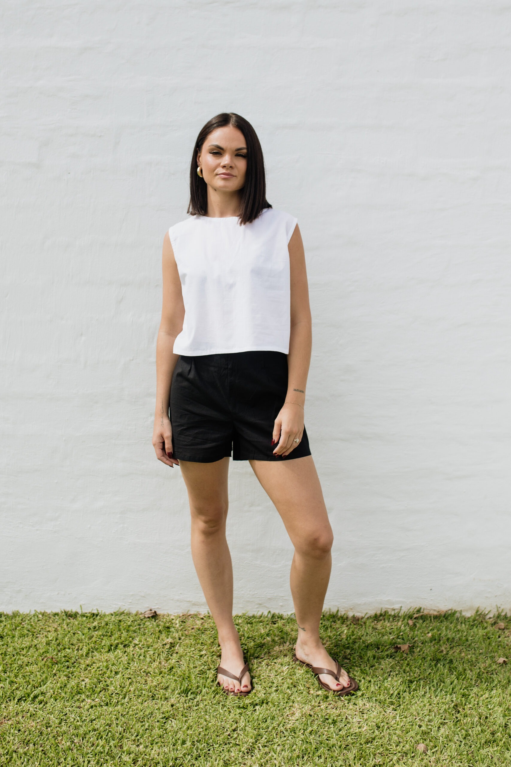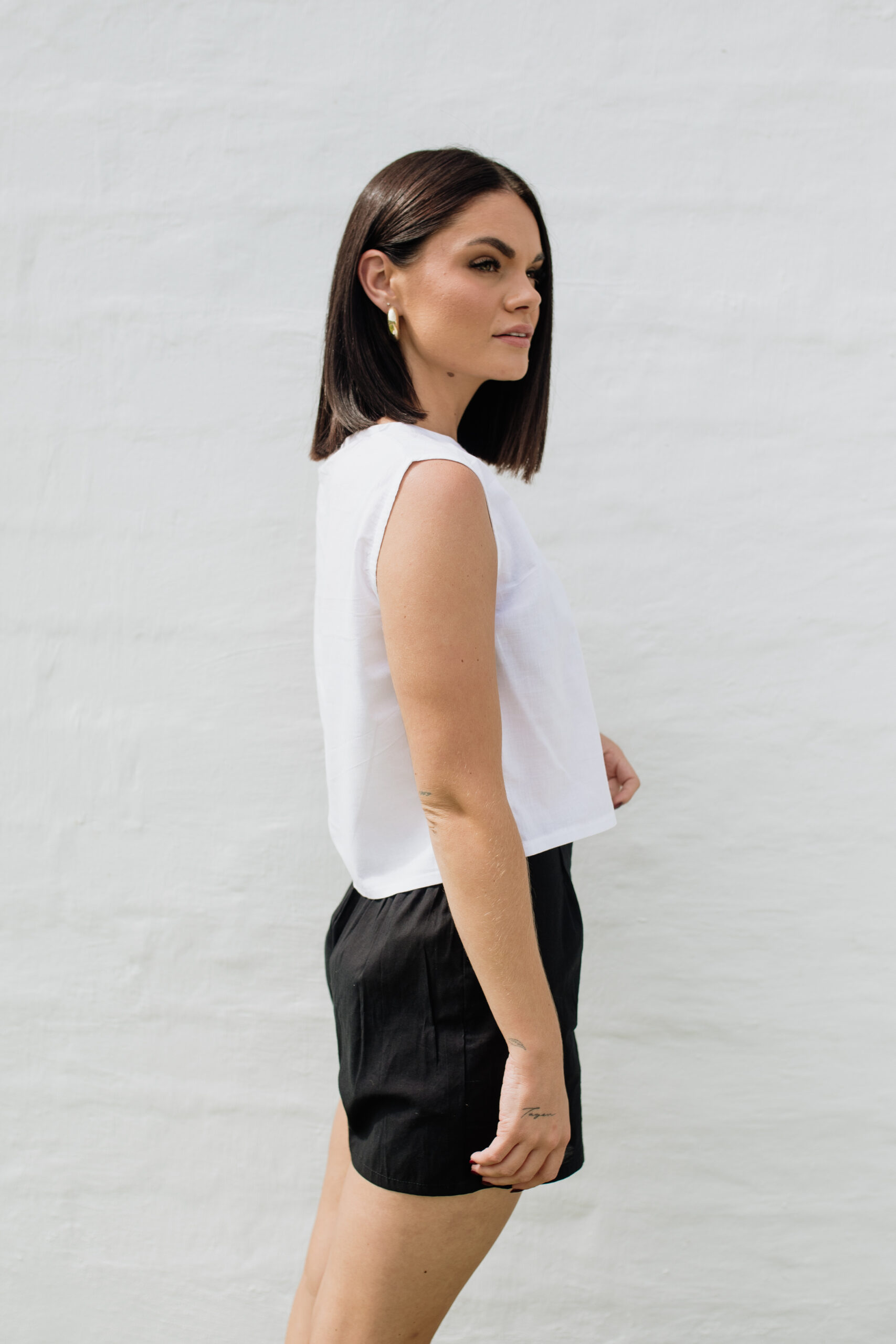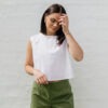 This simple yet versatile crop top, with its sleeveless design, projects a relaxed, minimal aesthetic, making it an ideal piece for warm days or layering under your favourite staples. The hemline gently grazes the waist, creating a flattering look that covers enough but not too much. Made in our basic range of plain colours, with limited edition releases in fun seasonal colours and prints. Whether styled casually or dressed up, this crop top brings an understated elegance to any look.
