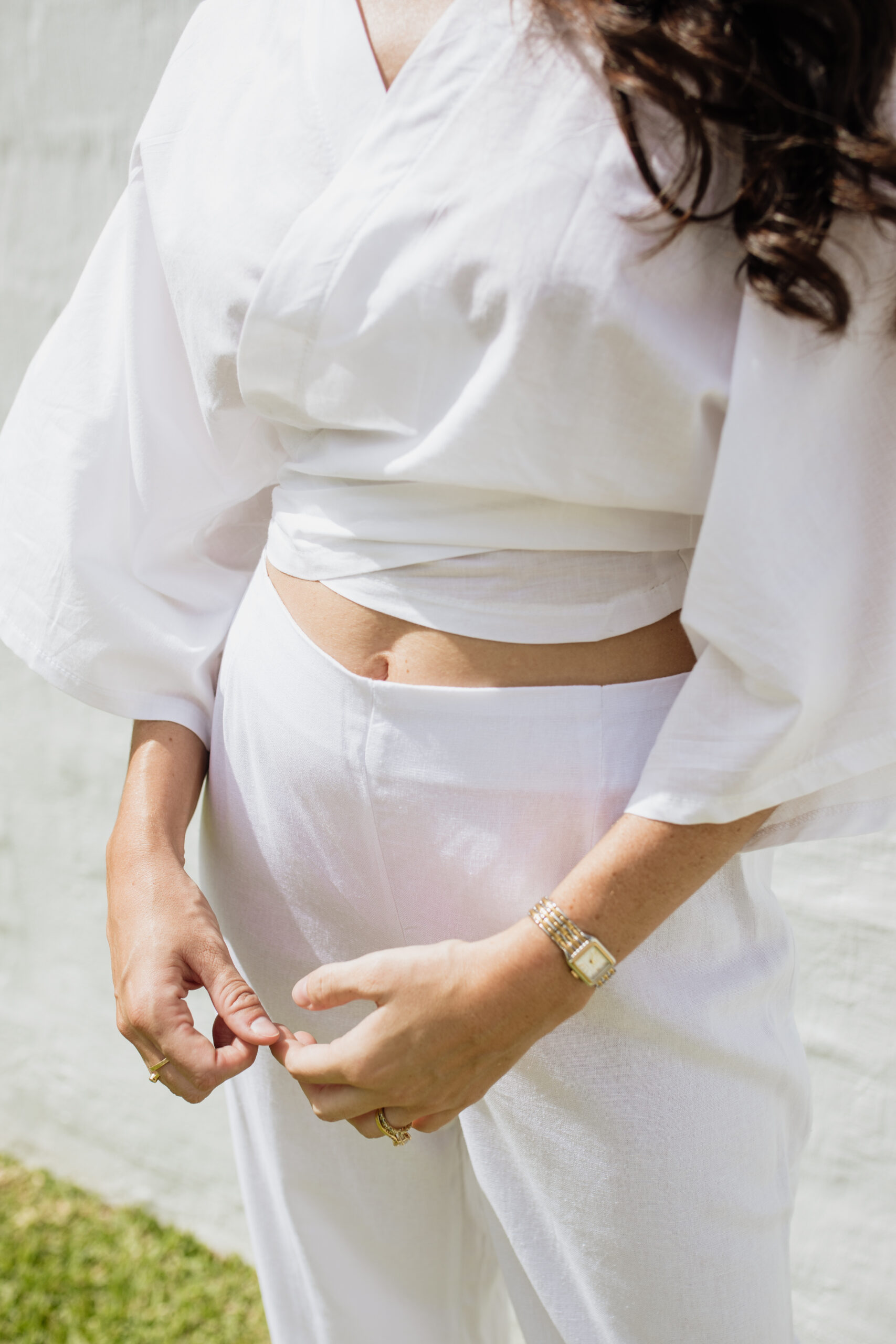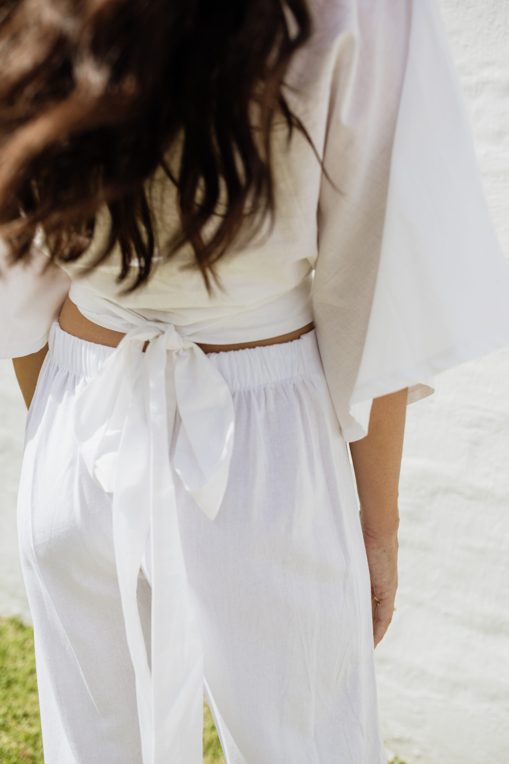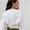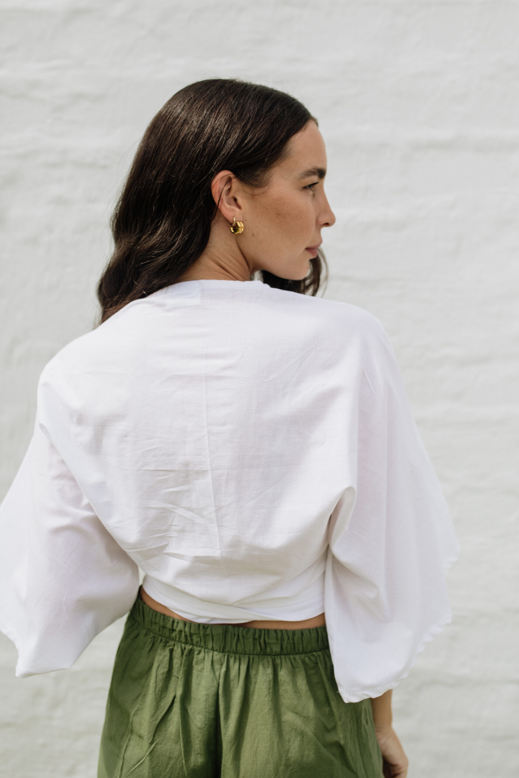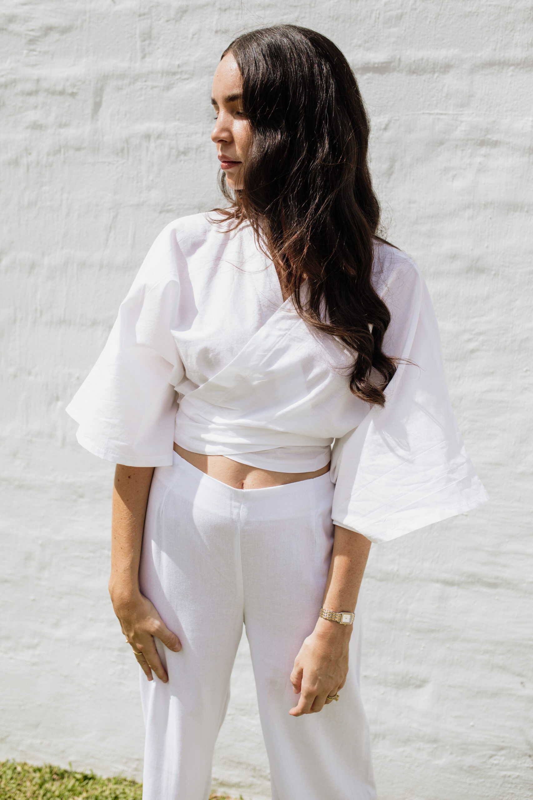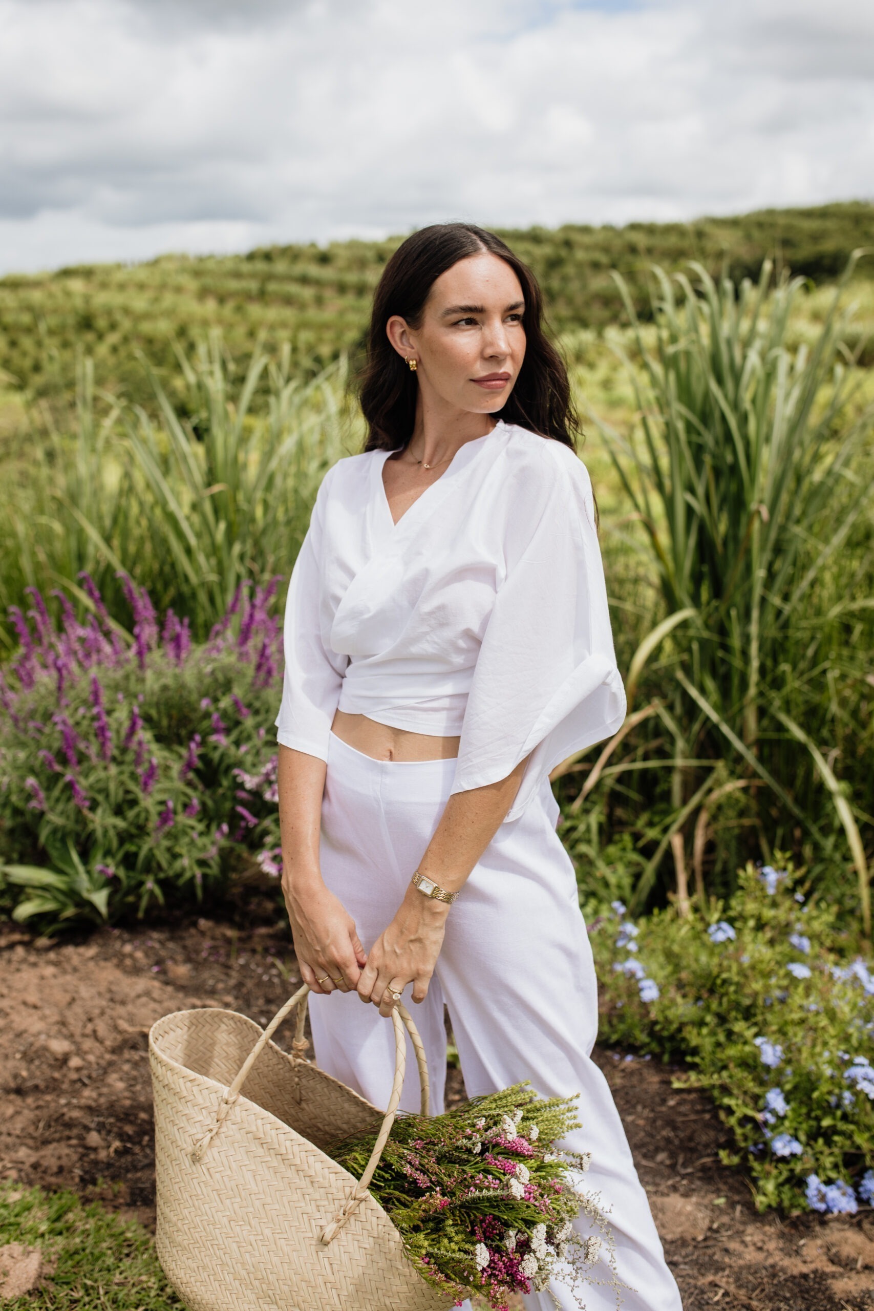 This blouse features a flattering wrap design that cinches at the waist for an adjustable, feminine fit. The relaxed sleeves and fluid drape allow for easy movement and comfort. This wardrobe staple is ideal for both casual days and dressed-up evenings. Crafted from our signature breathable, lightweight cotton, this piece is designed to keep you cool while offering a soft, natural feel against your skin. Pairs beautifully with our wide leg pants and flat front shorts and even a pair of jeans, creating a sophisticated look.