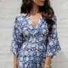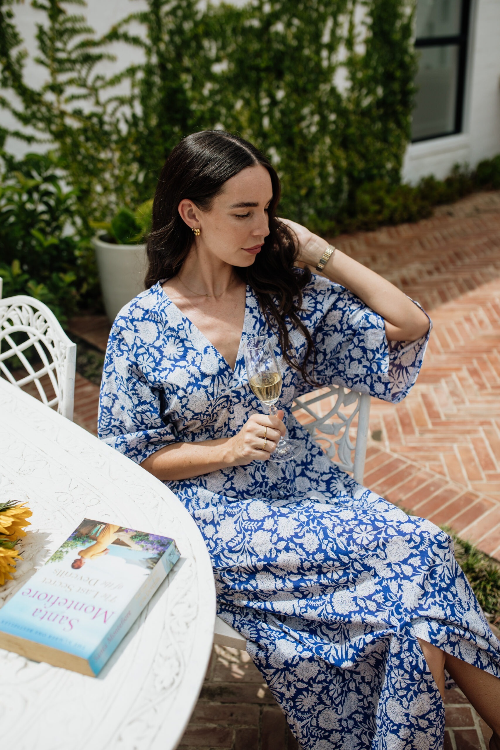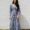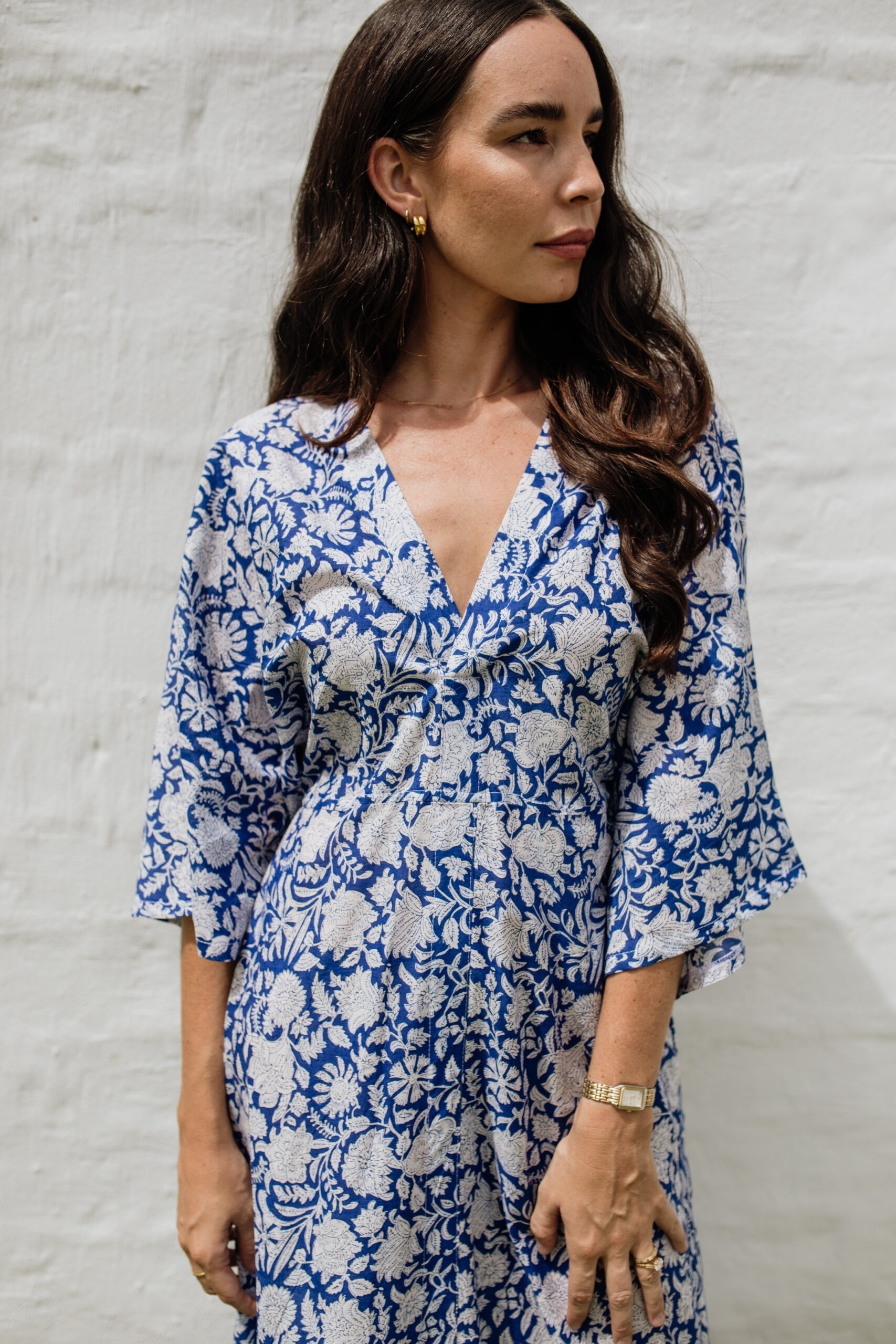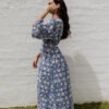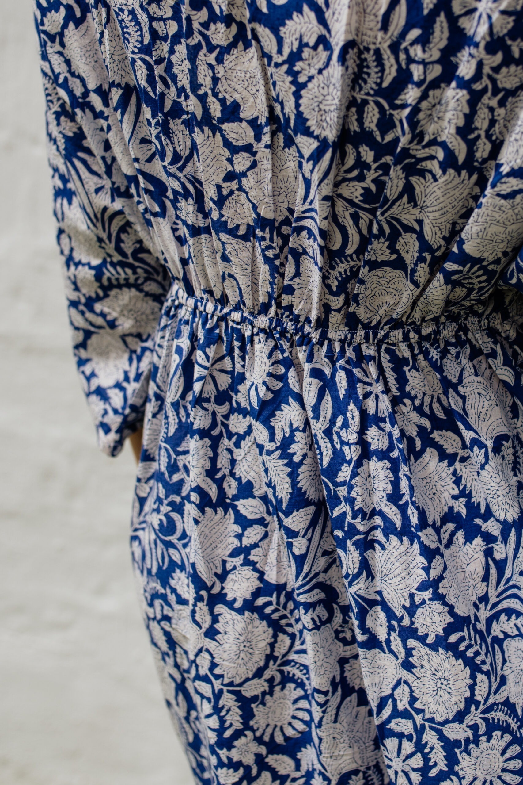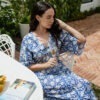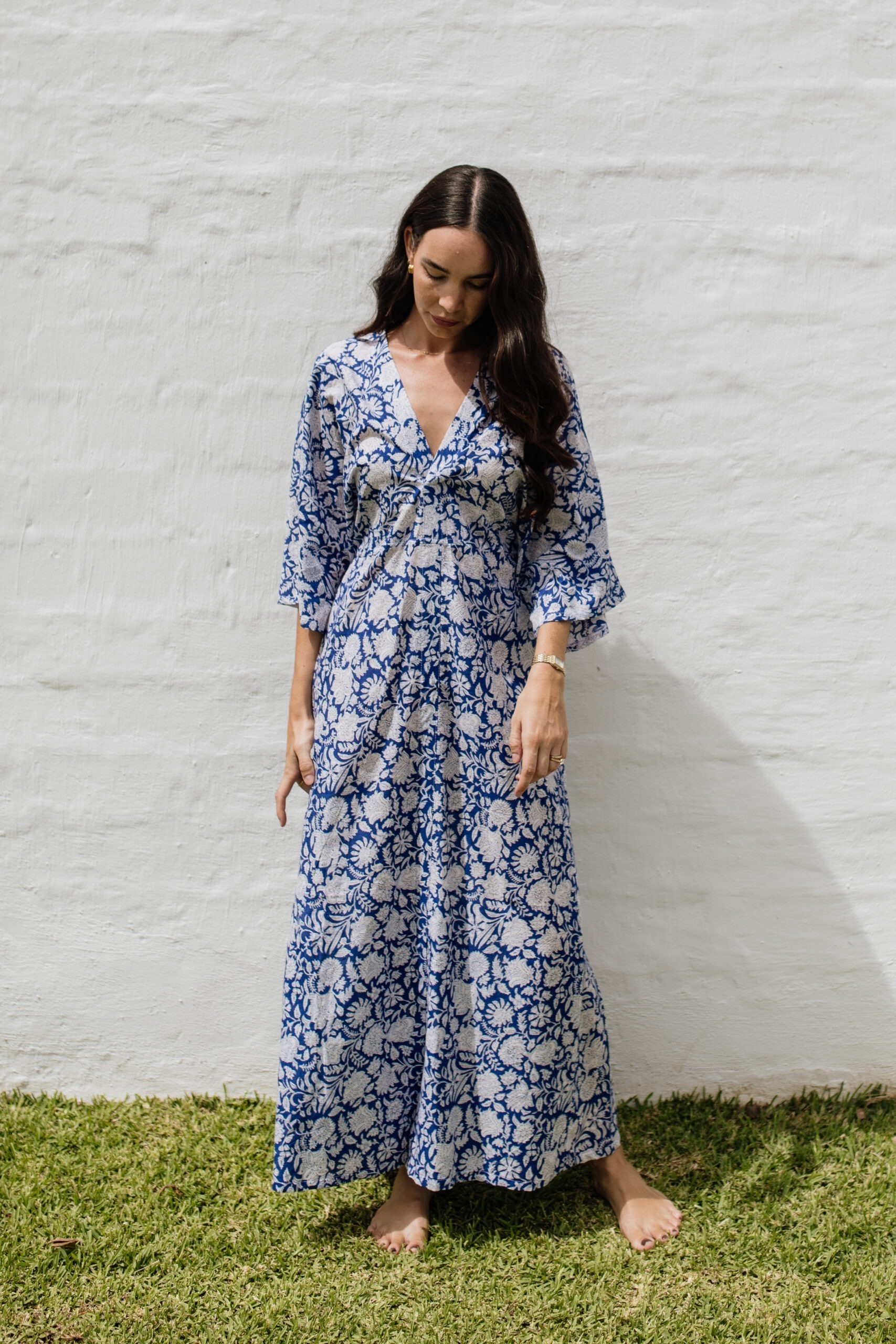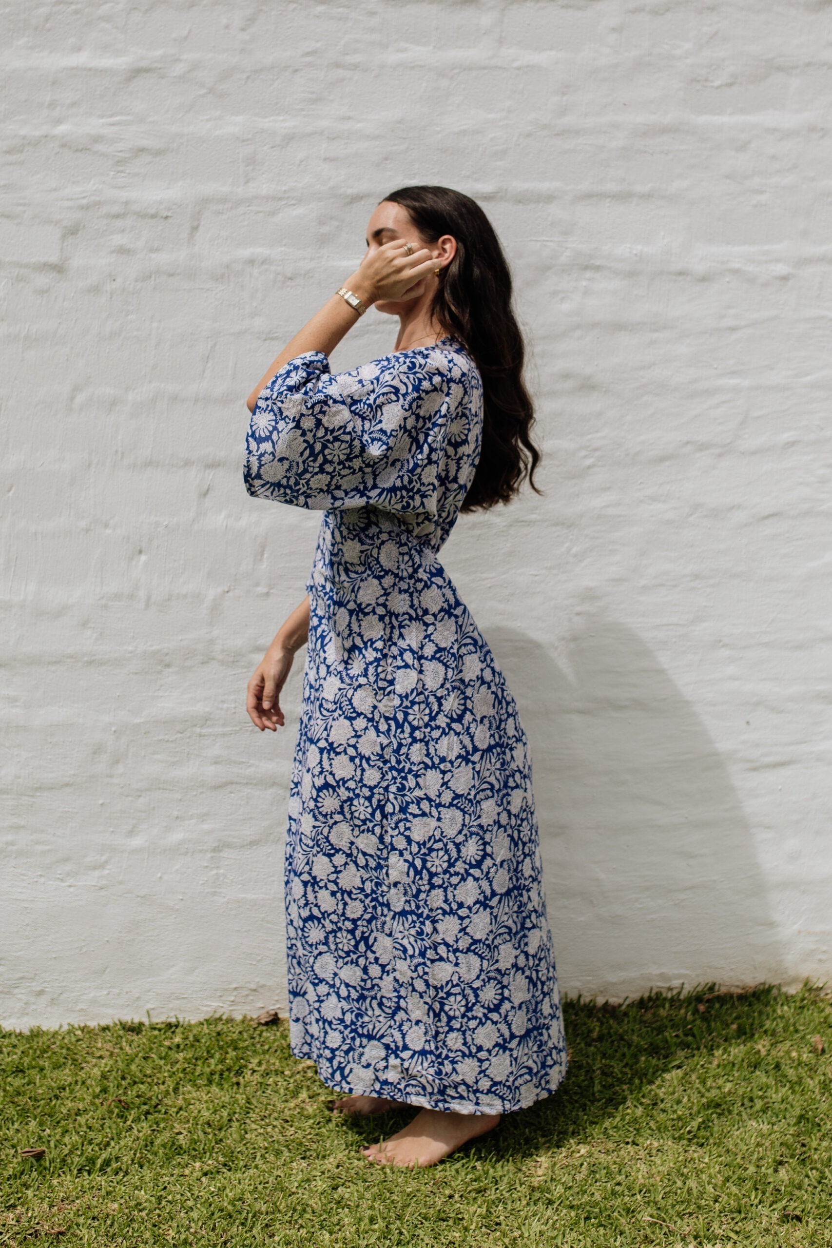 A kimono-style long dress made from Indian cotton, with a fluid silhouette and soft, flowing lines.