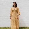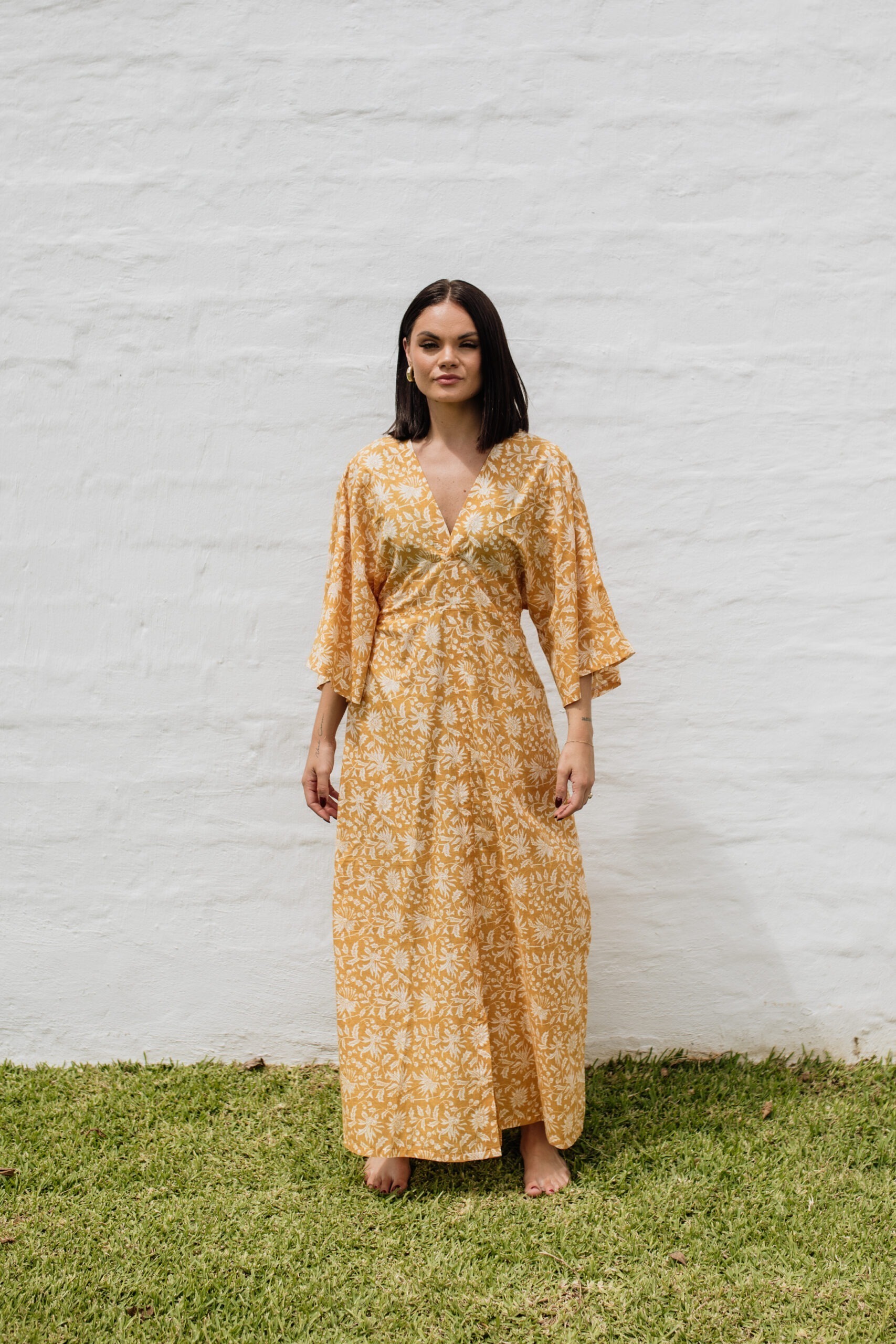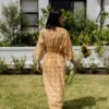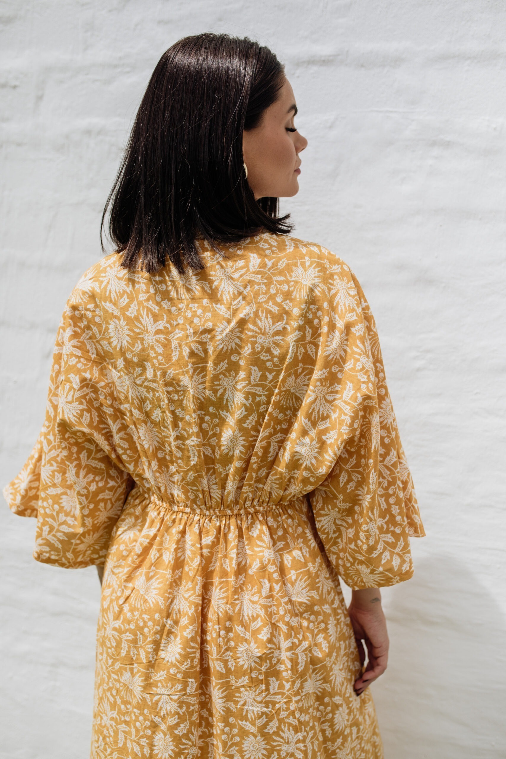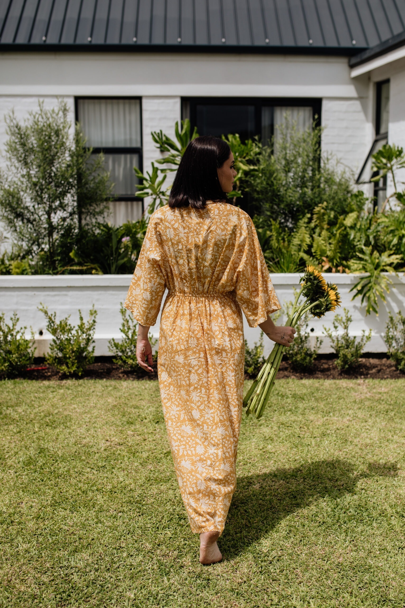 A kimono-style long dress made from Indian cotton, with a fluid silhouette and soft, flowing lines.